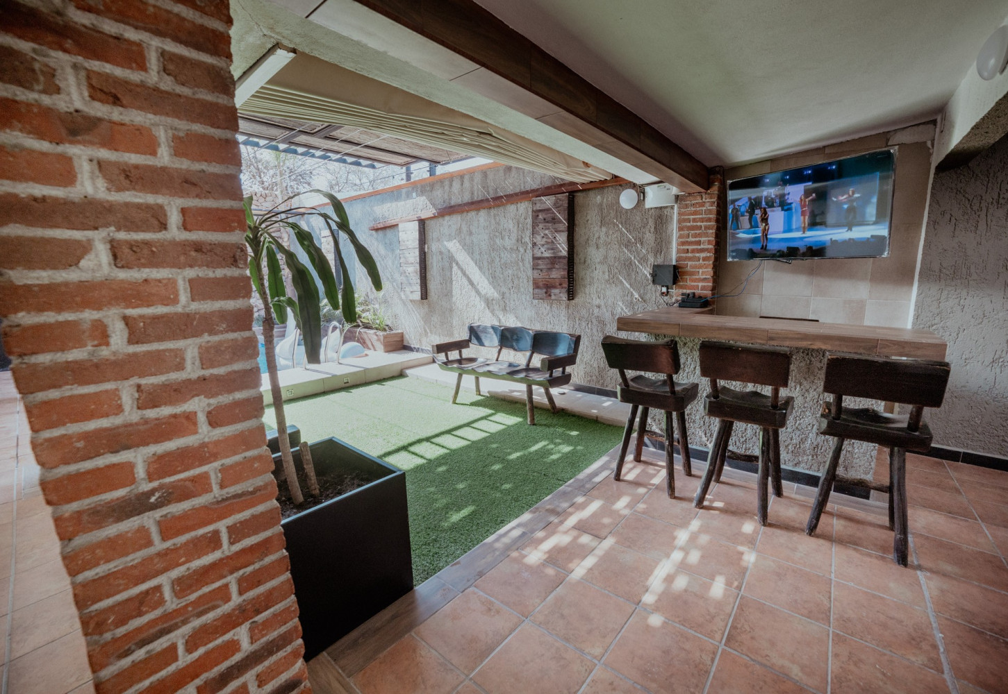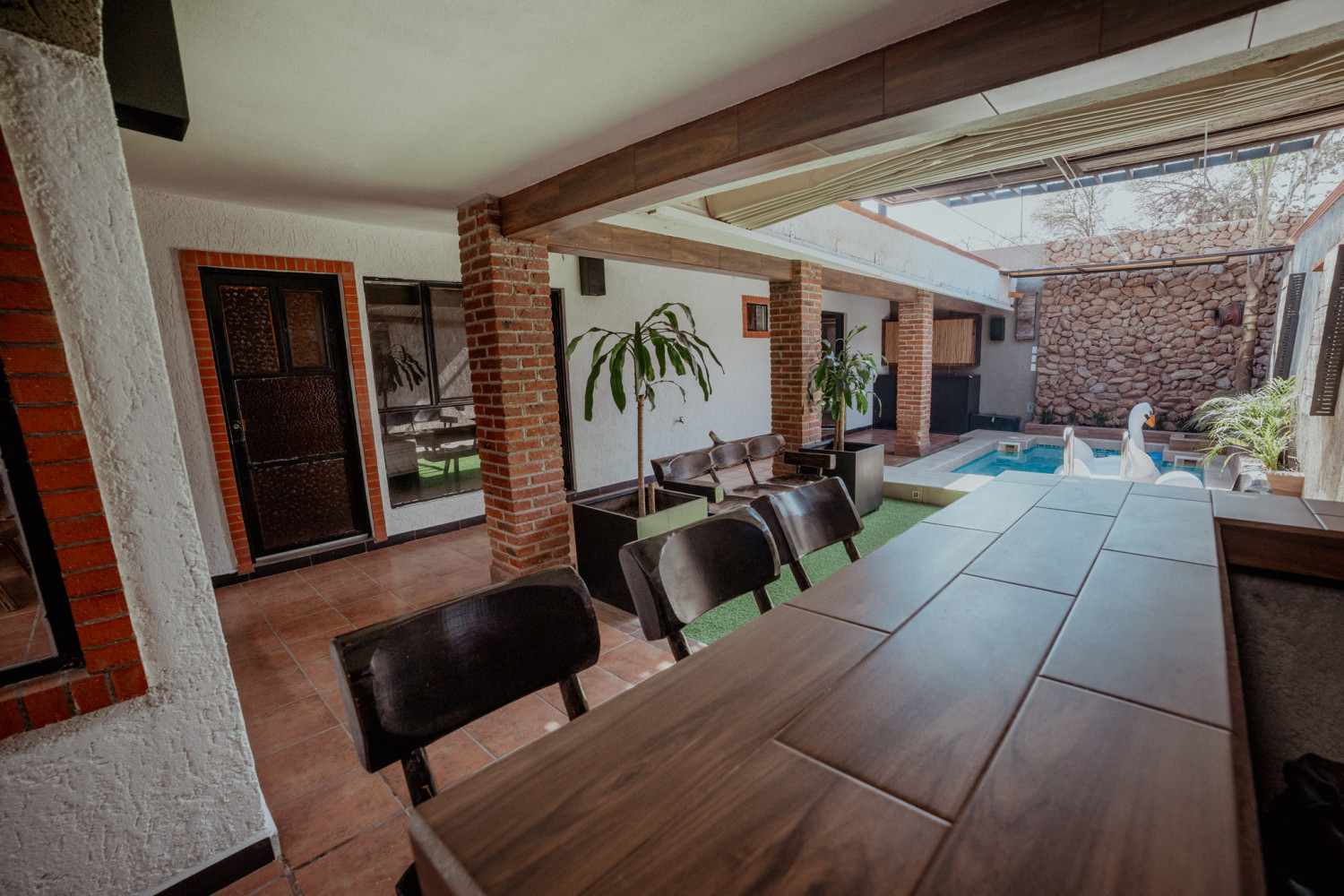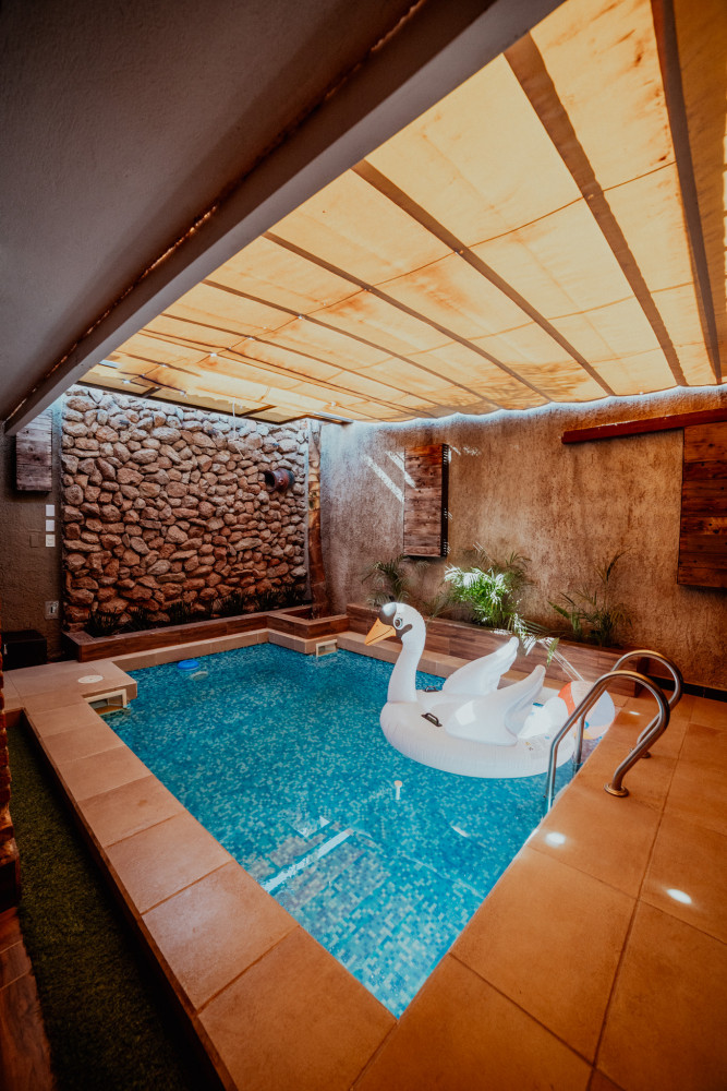Área de alberca con techo retráctil, ideal para cerrarse en días fríos y disfrutar de una alberca techada.